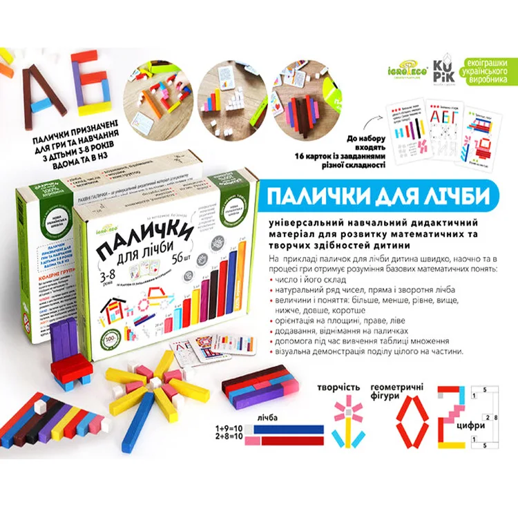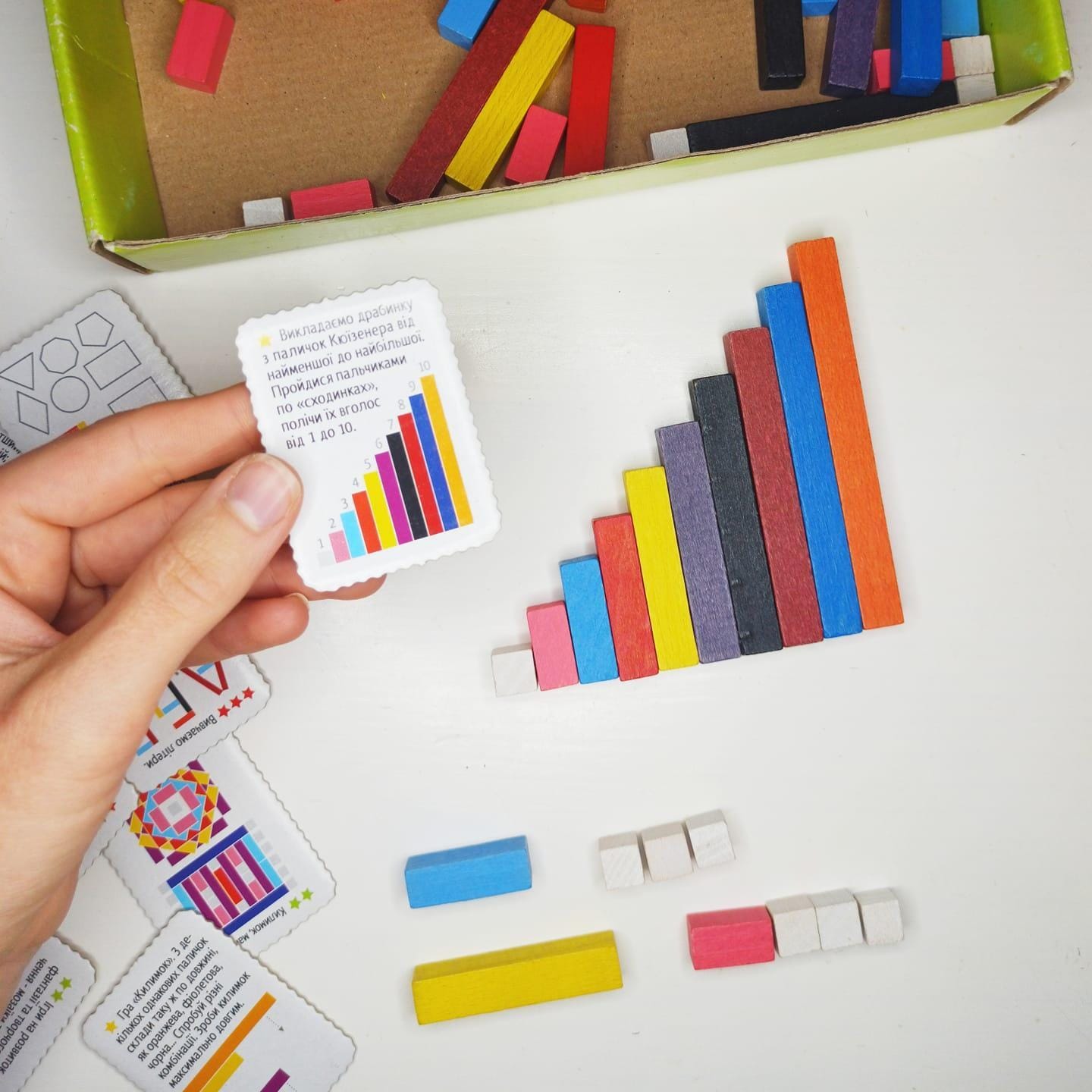 Набір кольорових паличок для рахунку за методикою Кюїзенера – універсальний дидактичний матеріал для знайомства дитини з числом і його складом, поняттями «більше-менше», «вище-нижче», «довше-коротше» і т.д., а також допомога у вивченні таблиць додавання, віднімання і множення.