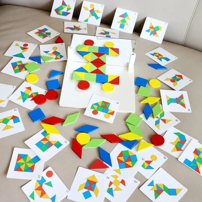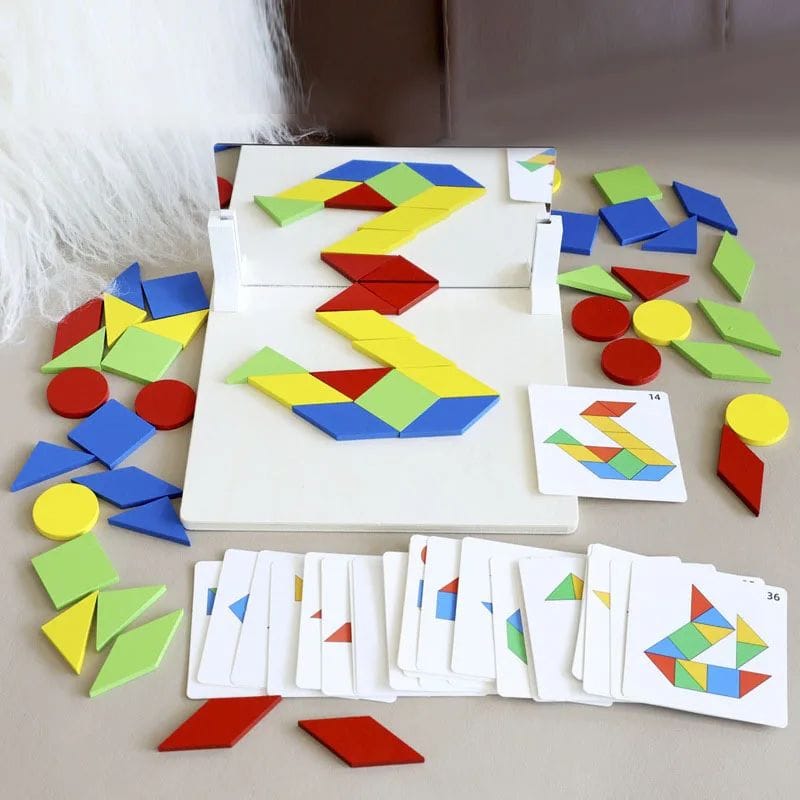 У наборі — різнокольорові дерев’яні деталі різних форм (трикутники, квадрати, кола, ромби), з яких дитина складає фігури за зразками.