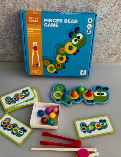 У наборі: кольорові кульки, пінцет, палички та 40 карток із завданнями.