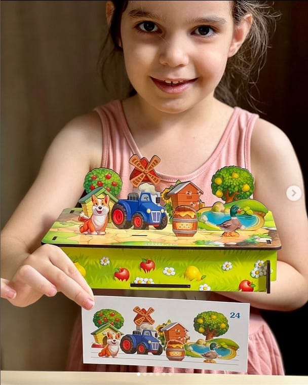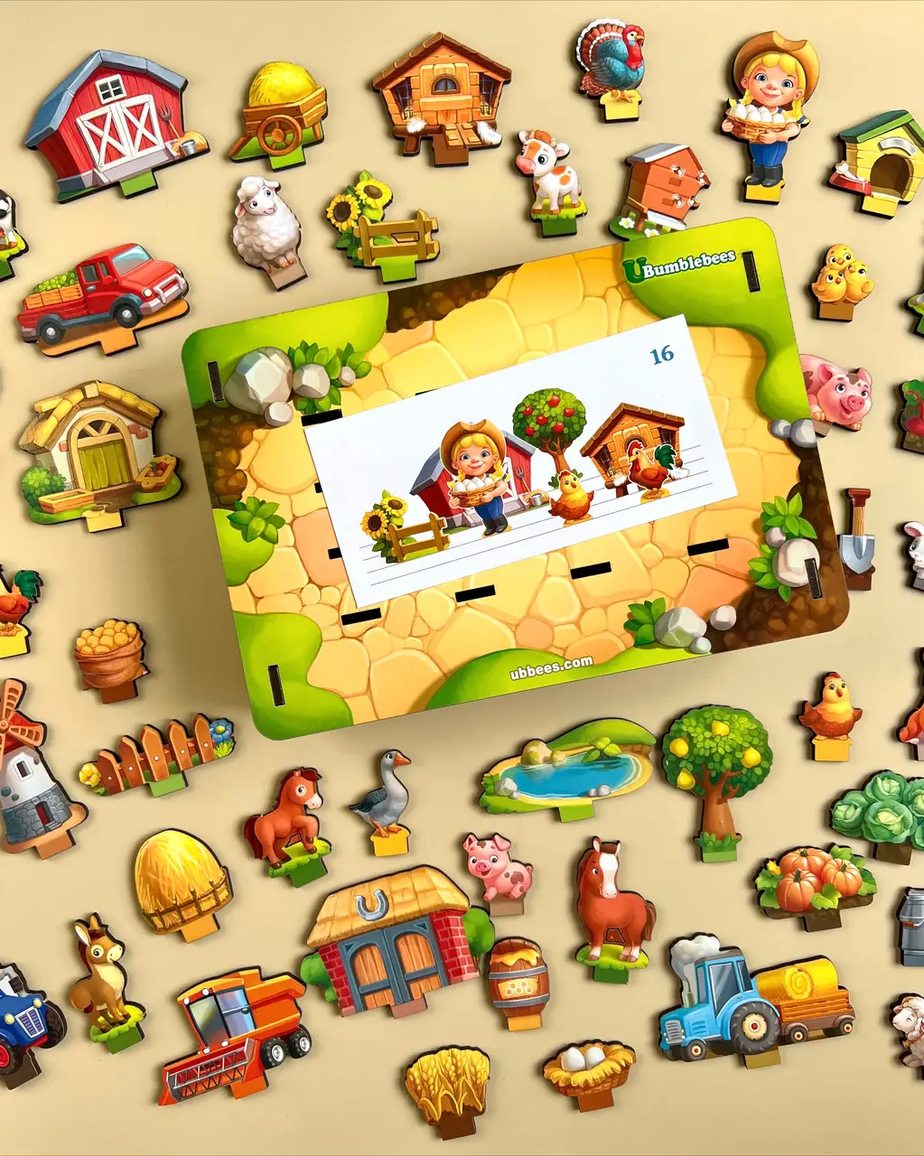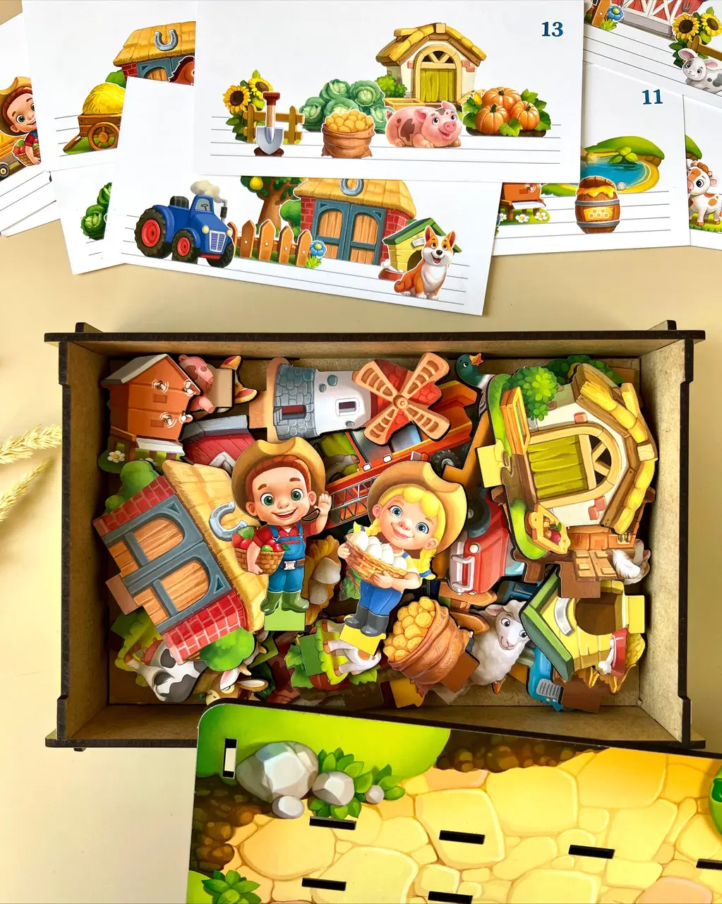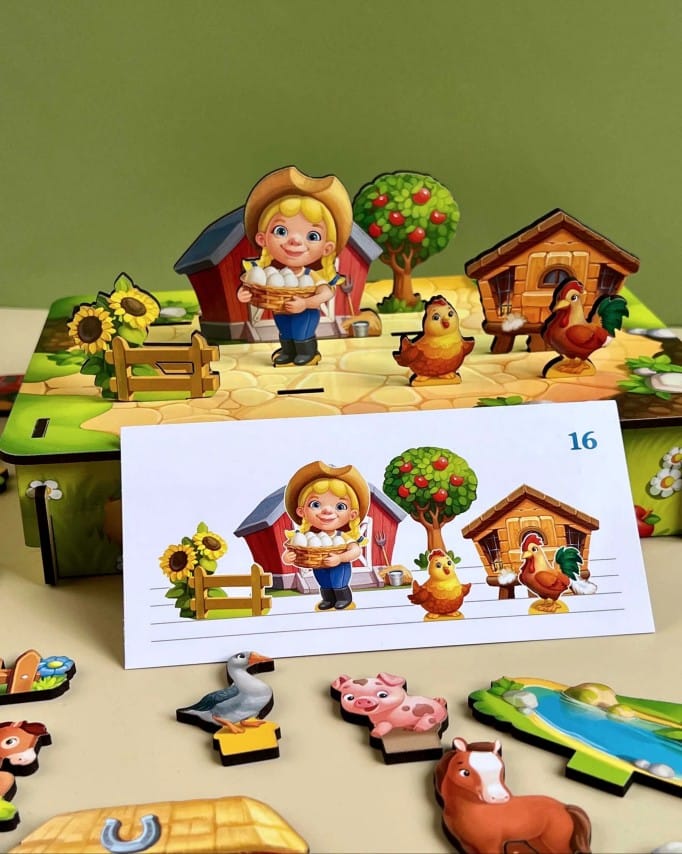 Гра з картками “Панорама: ферма” – це перехід від площини до об’ємного сприйняття дитини. Гра – тренажер для моторики рук, завдання – вставити фігурку під прямим кутом. Непосиди навчаться концентруватися, орієнтуватися у просторі, розвинуть глазомір і збагатять словниковий запас. За допомогою карток-схем дитина створить картину, розвине сюжет, складе коротку розповідь на тему. Відмінний посібник для вивчення прийменників: постав корову праворуч від кошика і перед парканом.