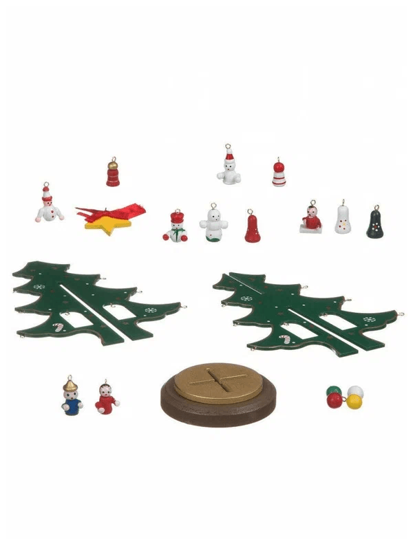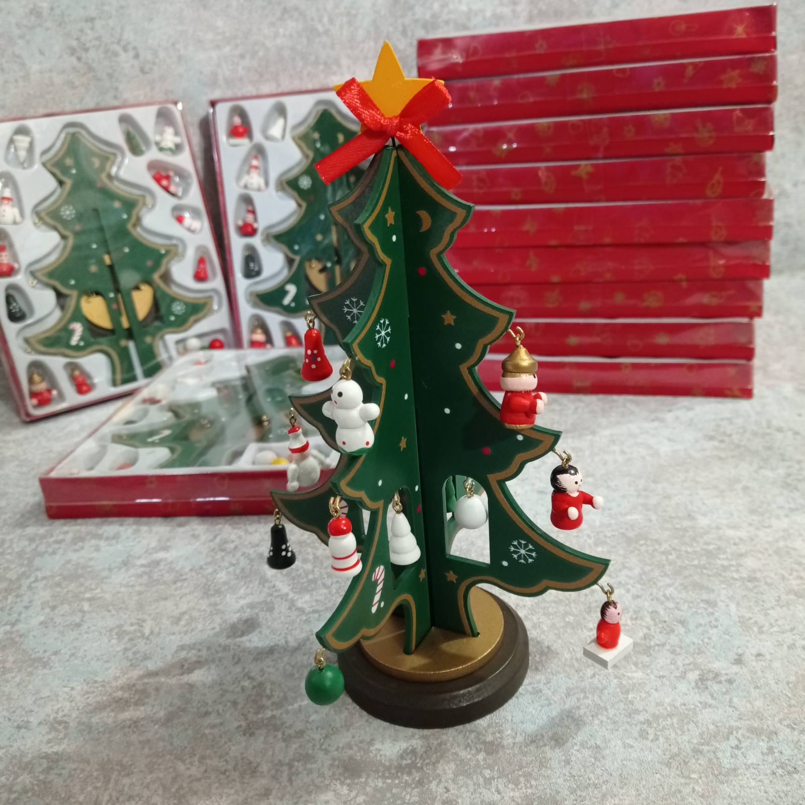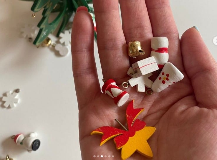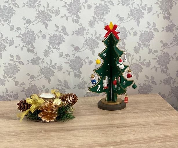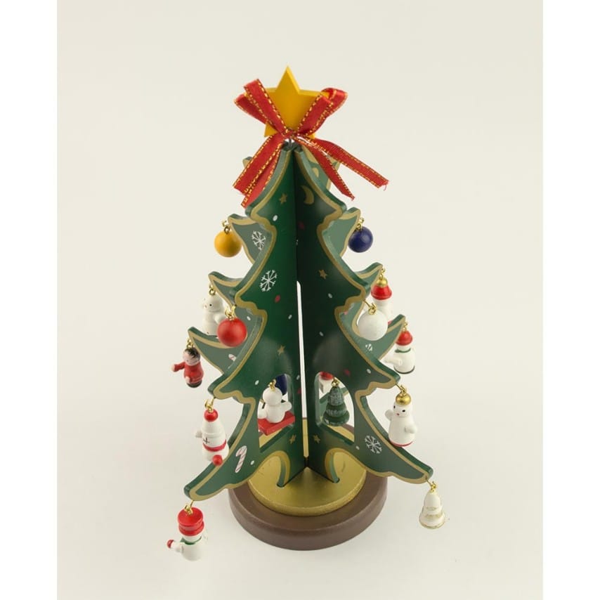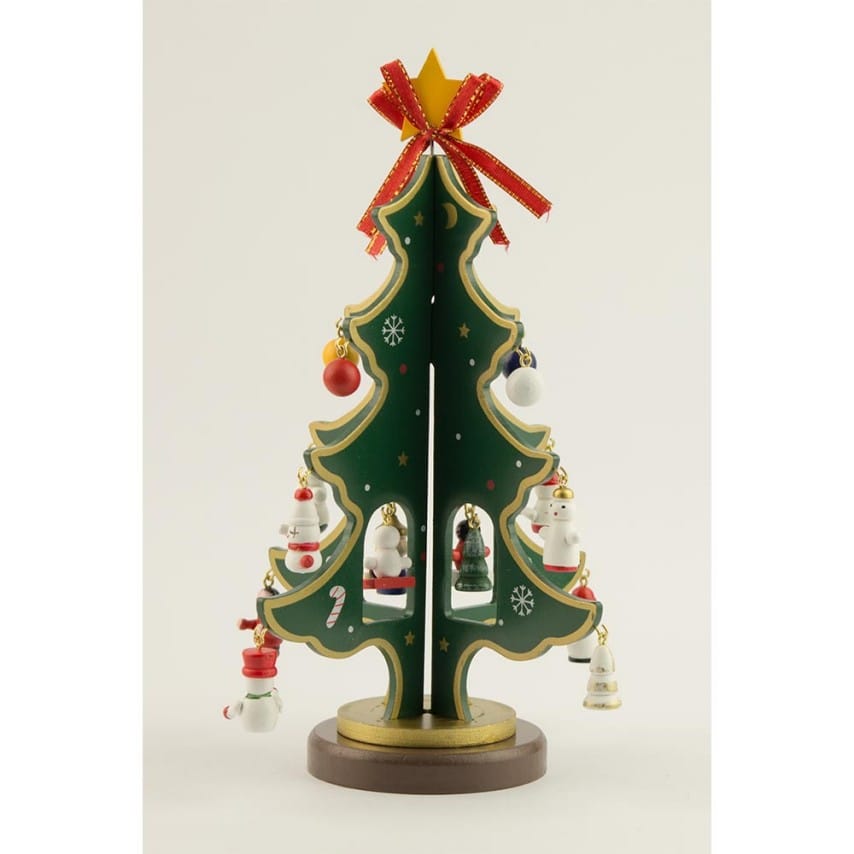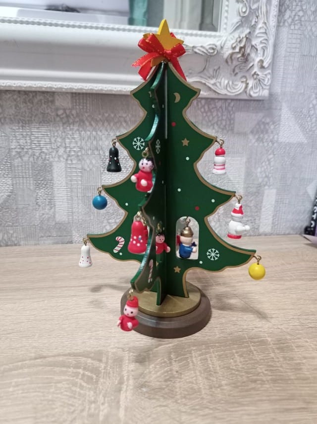 Ялинка прикрашена мініатюрними розмальованими вручну дерев’яними іграшками: на її гілках можна знайти будиночки, паравозик, янголят, сніговиків і новорічні кулі. Ялинка створює святковий настрій на роботі і вдома.