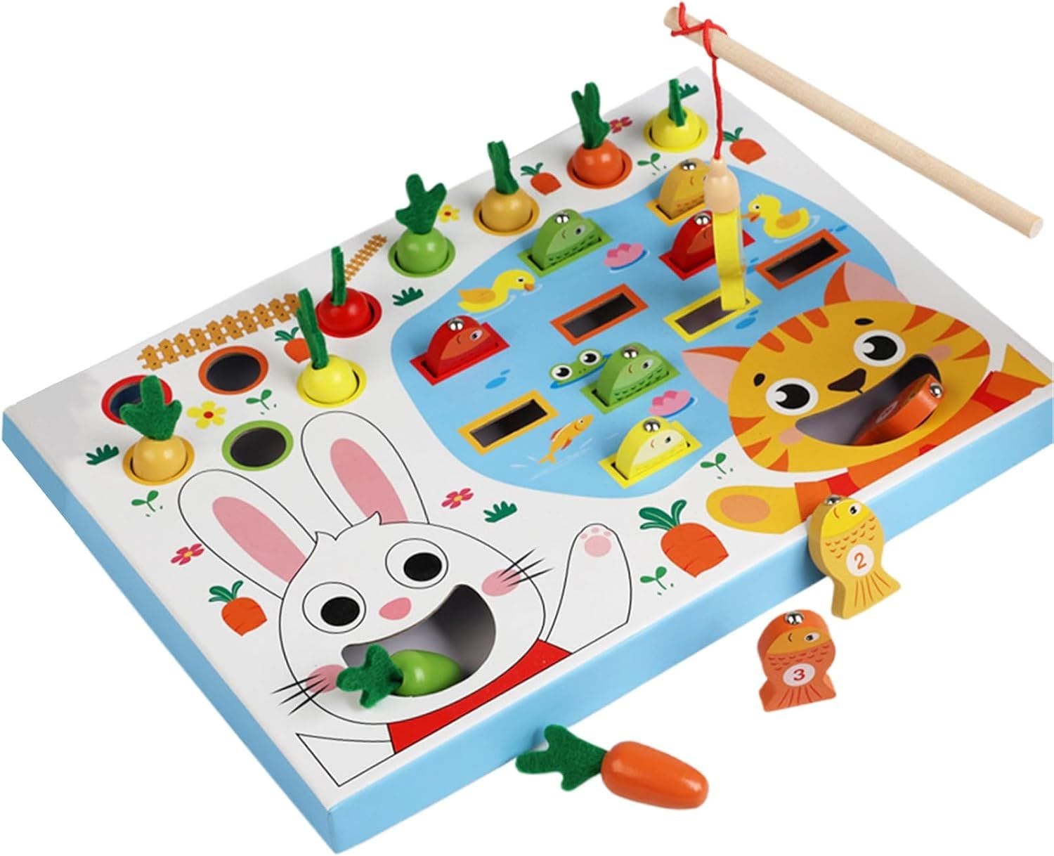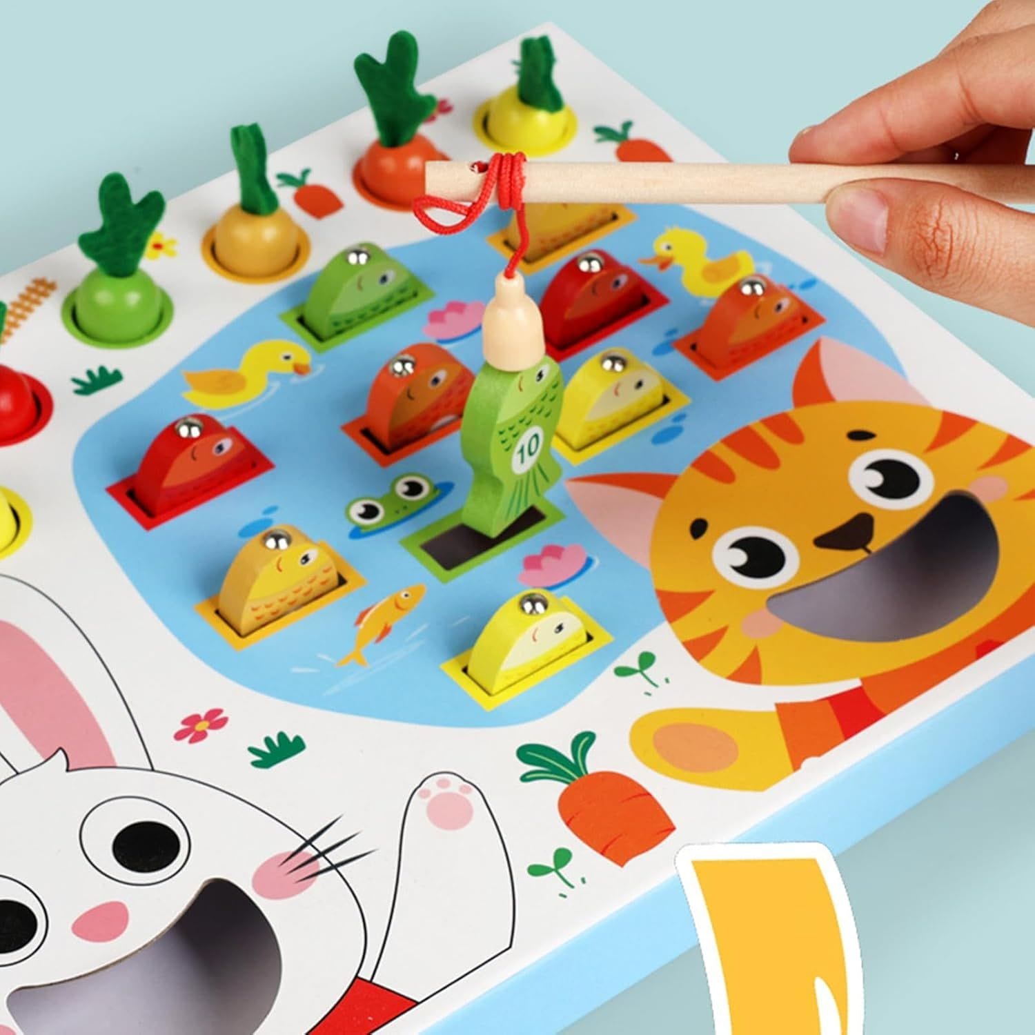 Гра поєднує дві активності — ловлю рибки магнітною вудочкою та витягування морквинок із грядки. Дитина за допомогою вудочки “ловить” кольорових рибок, а морквинки сортує за розміром і кольором, тренуючи дрібну моторику, координацію та увагу.