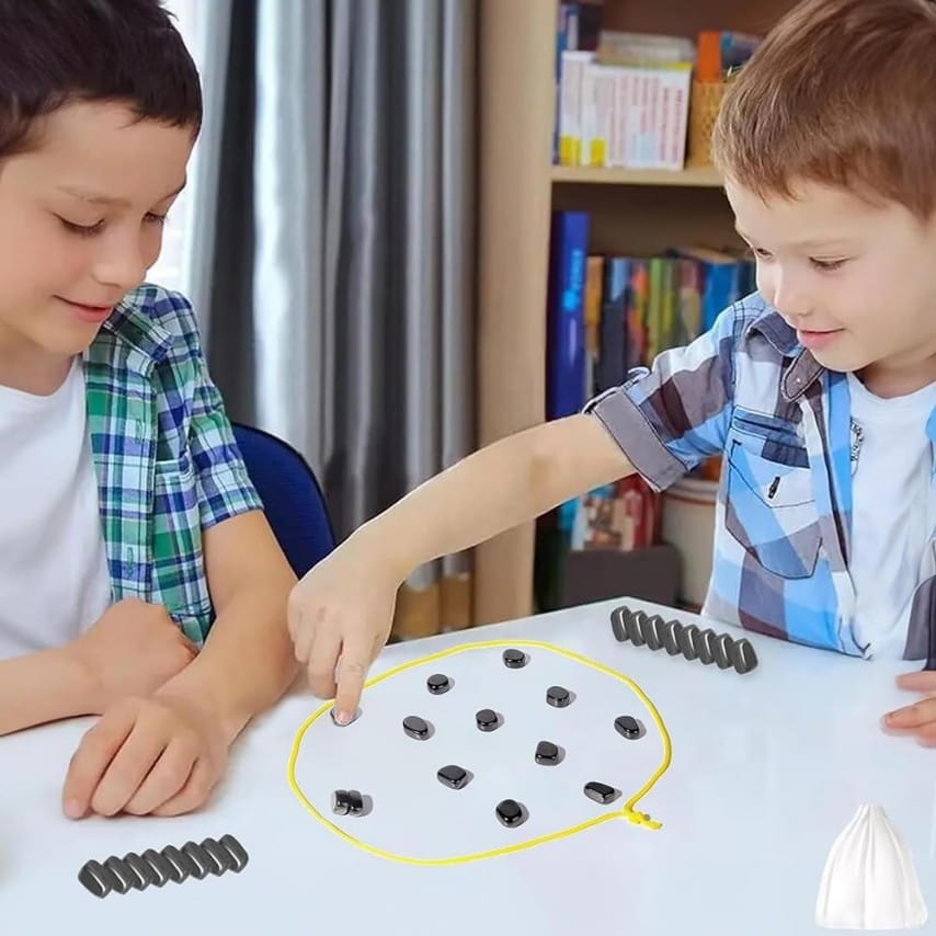 Правила елементарні – магнітні камінці порівну розподіляються між кількістю гравців (усього магнитів 20). Задача кожного гравця по черзі розміщувати камінець-магніт усередині ділянки, яка обмежена шнуром.