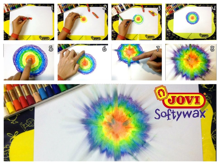 Воскові крейди JOVI Softywax залишають на папері яскравий слід фарби, схожої по текстурі з пастеллю. Лінії, виконані нашими крейдою, виходять дуже щільними і однорідними. Вони легко накладаються один на одного.