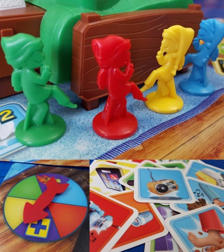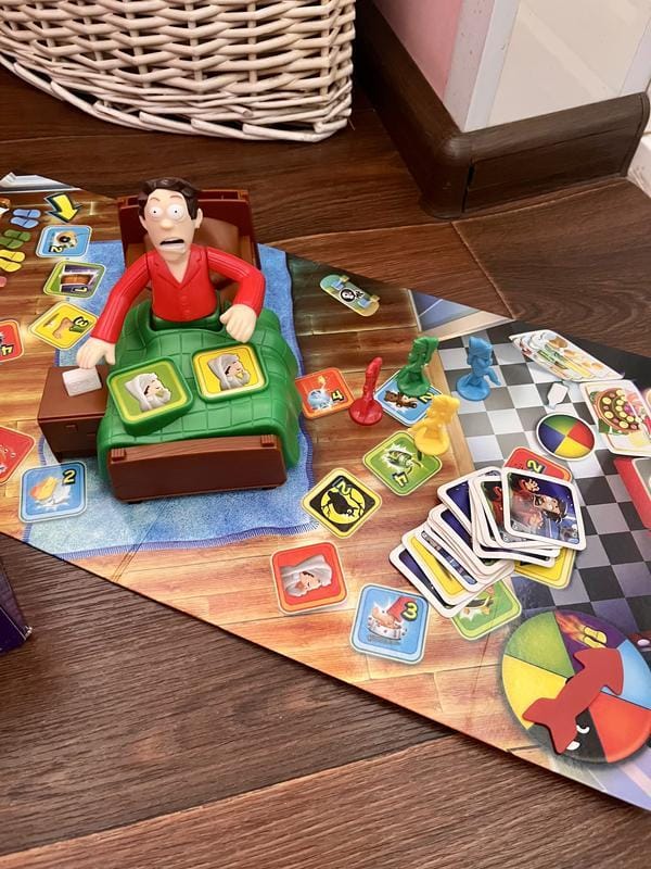 Комплектування: 1 фігурка тата в ліжку; 4 фігурки гравців; 1 ігрове поле; 16 карток; 1 стрілка; 1 аркуш із наліпками. Кількість гравців: 2-4. Час гри: 20 хв.